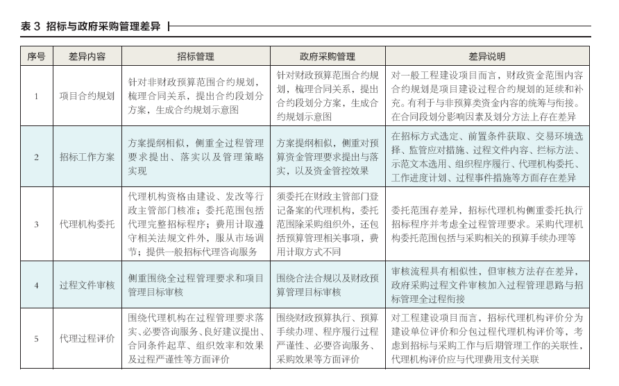 工程建設(shè)項(xiàng)目招標(biāo)管理是指站在建設(shè)全過(guò)程視角對(duì)招標(biāo)活動(dòng)實(shí)施的一系列管理工作。同理,政府采購(gòu)管理指采購(gòu)人針對(duì)擬組織實(shí)施的采購(gòu)活動(dòng)開(kāi)展的一系列管理工作。政府采購(gòu)管理過(guò)程除遵循財(cái)政預(yù)算控制要求外,依然需將全過(guò)程思想貫穿始終。上述兩類(lèi)活動(dòng)管理目標(biāo)均包括降低過(guò)程風(fēng)險(xiǎn)、提升交易效率、確保交易質(zhì)量、滿足全過(guò)程管理要求等。招投標(biāo)或政府采購(gòu)管理工作內(nèi)容均包括:合約規(guī)劃、工作方案編制、代理機(jī)構(gòu)委托、過(guò)程文件審核、招標(biāo)與采購(gòu)代理過(guò)程評(píng)價(jià)等方面。針對(duì)上述內(nèi)容,兩類(lèi)活動(dòng)有關(guān)差異內(nèi)容詳見(jiàn)表3。